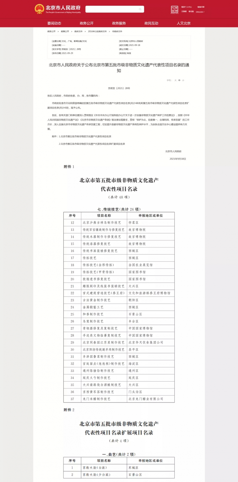 2021年9月29日,北京市人民政府公布北京市第五批市级非物质文化遗产代表性项目名录和扩展名录,其中第五批市级非物质文化遗产代表性项目名录48项,扩展项目名录4项。我区传统技艺类项目“和香制作技艺”、曲艺类项目“京韵大鼓(少白派)”分别名列其中。