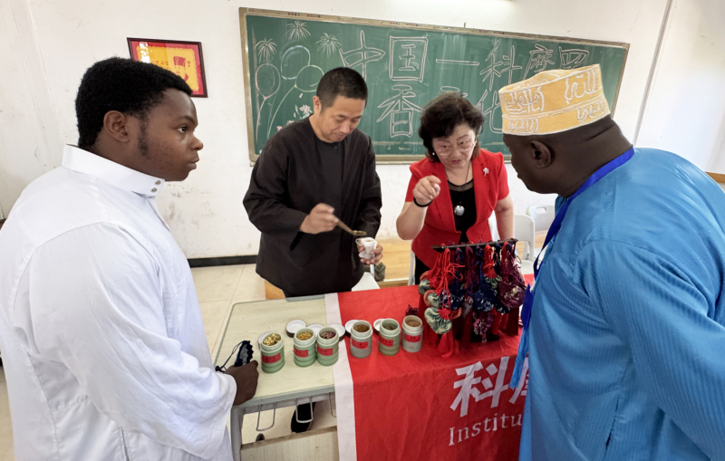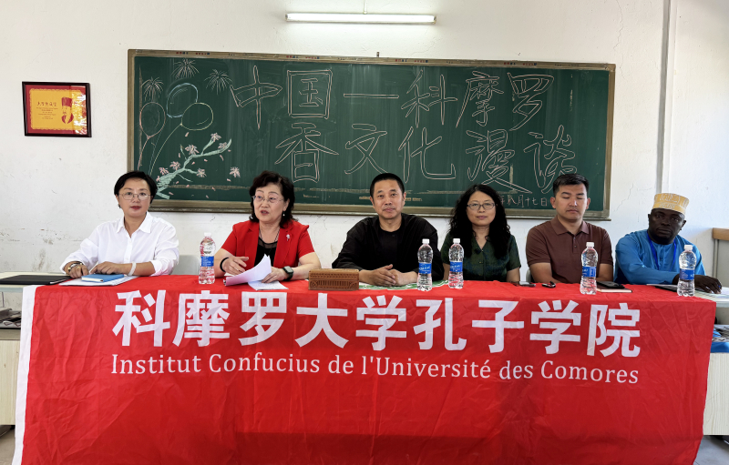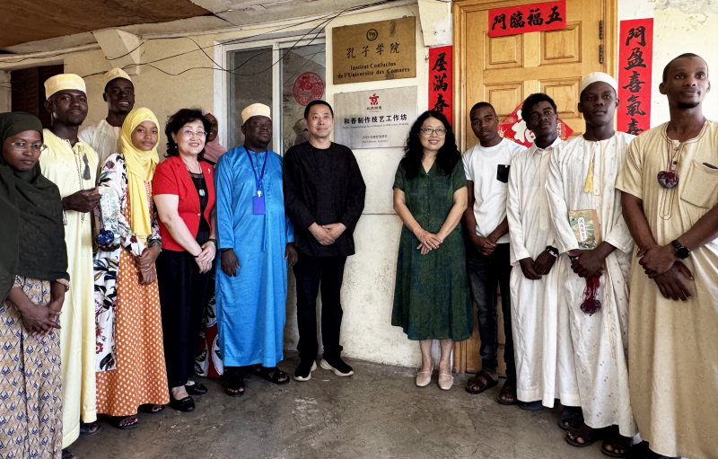 2025年8月17日上午,在科摩罗大学孔子学院驻地CUFOP,中国民俗学会中国香文化研究中心代表团与科摩罗OCPR 代表KALAM和科摩罗大学孔子学院50余位师生,共同见证了北京市非遗“和香制作技艺”工作坊在孔子学院揭牌。