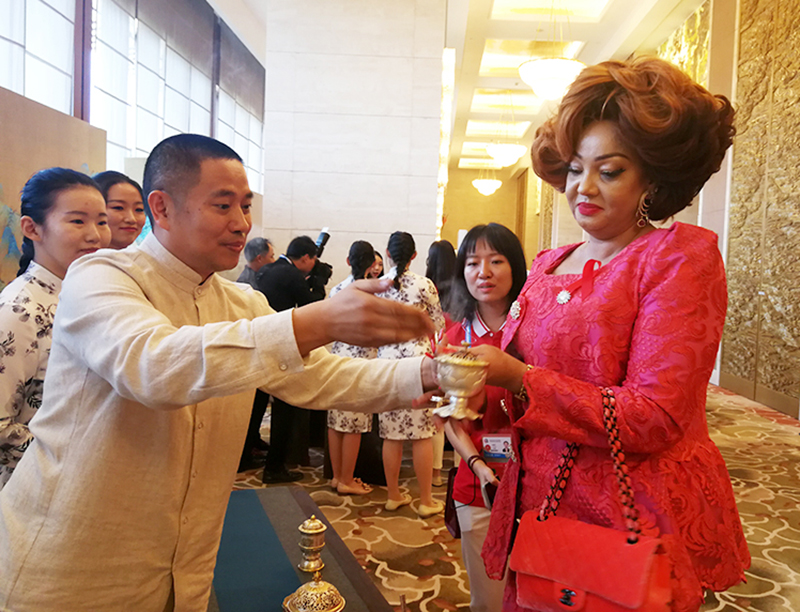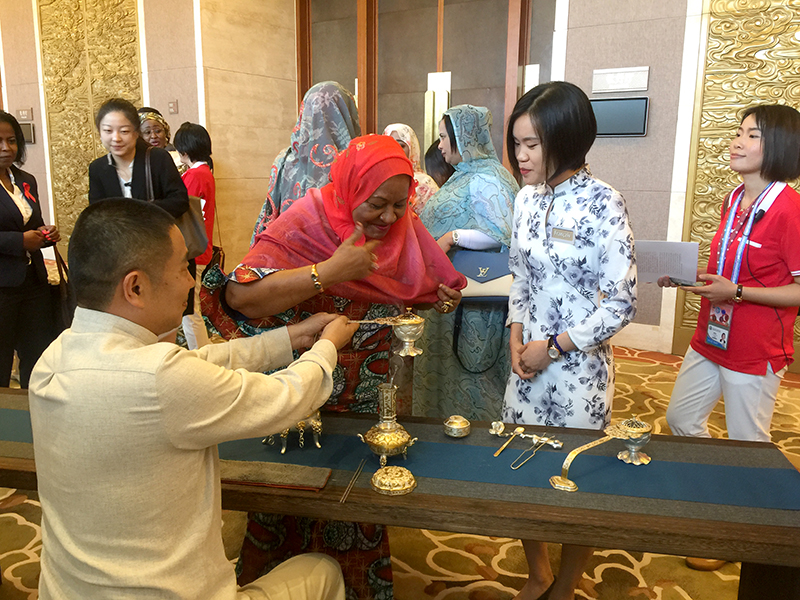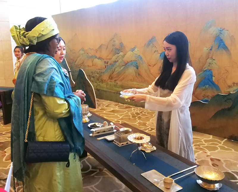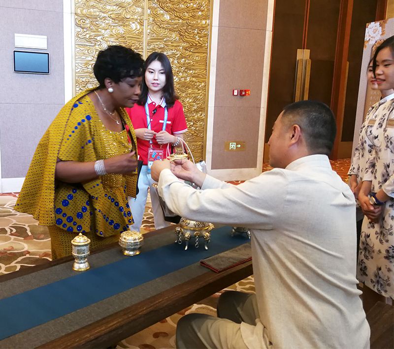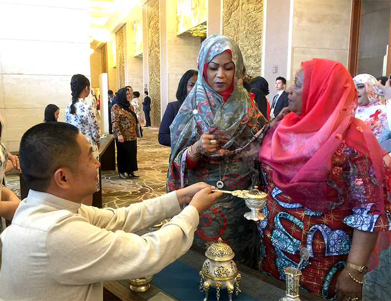 非洲多国领导人夫人来到香道、茶道展台前,对中国传统香文化和茶文化表现出极大兴趣,她们在翻译的解说下,亲身体验中国传统文化的魅力。中心主任孙亮运用近年来中心研究复原的传统品香仪轨,为非洲嘉宾们一一展演闻香流程。