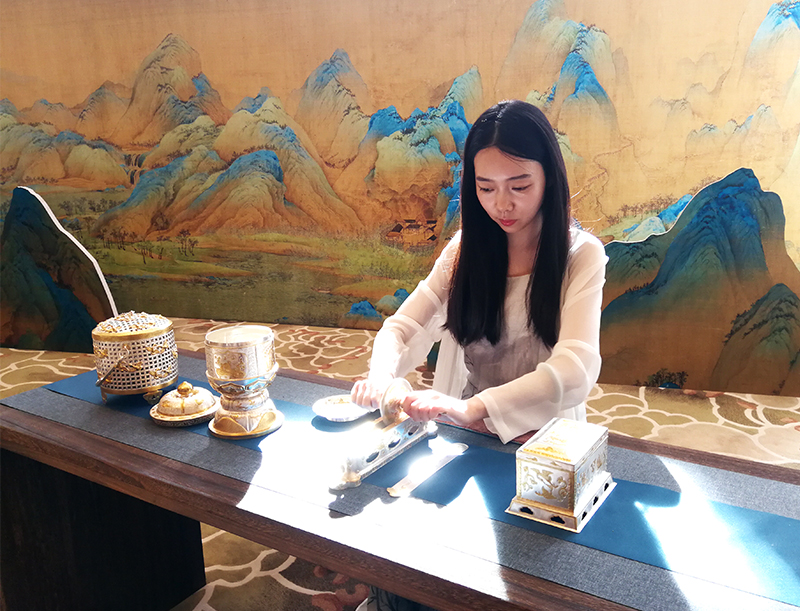 中国香文化发源于春秋战国时期,是中华民族以芬芳嗅觉为核心的文化实践与意识形态。本次选用的香丸是以唐代宫庭秘方为基础,以北京市石景山区非物质文化遗产代表项目“和香制作技艺”制作,另外还选用了海南野生沉香。焚香所用器具是用金银器錾刻工艺复原的唐代宫廷器物。